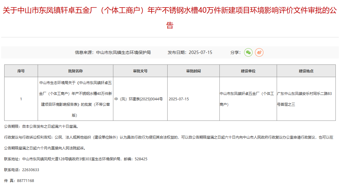 2025年7月15日,中山市東鳳鎮生態環境保護局就中山市東鳳鎮軒卓五金廠(個體工商戶)年產不銹鋼水槽40萬件新建項目環境影響評價文件作出審批意見并對外進行公告,公告期限:自本公告發布之日起滿六十日屆滿。